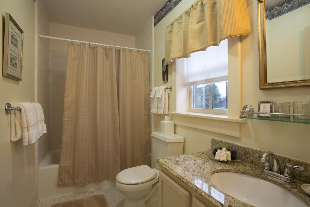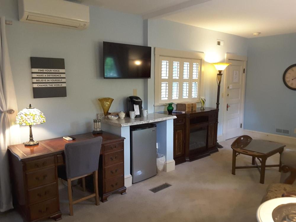 This room, also known as the Tiffany Guestroom, features a separate seating area with a small sofa and large flat-screen cable television. An electric fireplace with a cherry wood mantel.